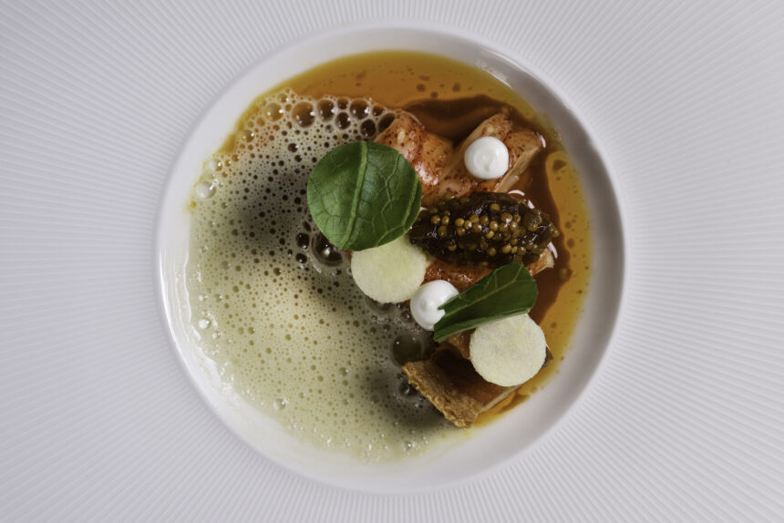 Eerst gemarineerd buikspek met geroosterde tofoe, appel, mosterdzaad en vinaigrette met tom yam en schaaldierenbouillon. Bij tomatensambal en een beurre blanc met pernod en venkel. Daarna gegrilde, gepekelde tarbot met sajoer, pandanblad, bananenketchup en gevulde kleefrijstrolletjes. En glaasjes Zuid-Afrikaanse chardonnay.