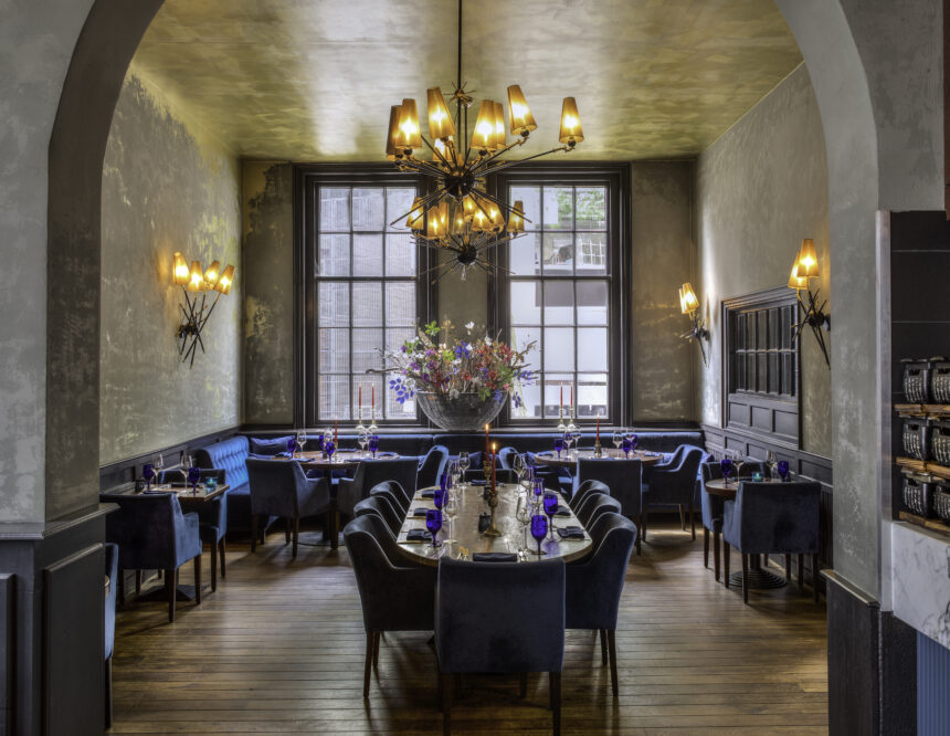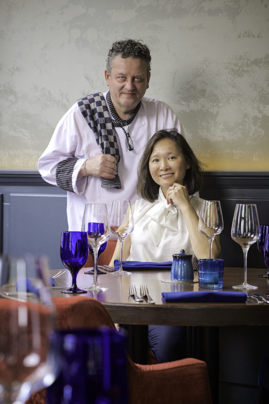 Samen zetten ze hun schouders onder een ingrijpende verbouwing, alles werd gestript, geschilderd en heringedeeld met als resultaat een in vijf ruimtes verdeelde chique ambiance met afwisselend houten- en tegelvloeren, hoogteverschillen, lambriseringen, muurbanken, rode en blauwe fauteuils, tafeltjes voor in totaal circa 140 couverts, bloemstukken, marmer, hoge ramen, een bar en een professionele keuken. Plus een terras aan de straatkant.