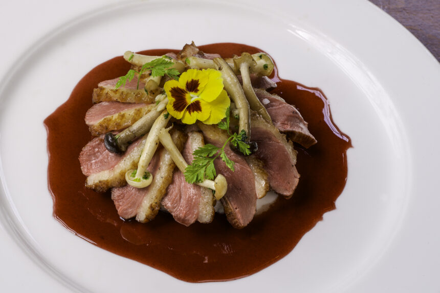 Gevolgd door een schotel van hand van Rudolf: eend. Geliefd vlees voor Peking- en Sichuan-koks maar ook voor een Brabantse kok. De borst is op de eigen vetkant in hete olie gebakken waardoor een krokant laagje is ontstaan, daarna doorgegaard in de pan en dán pas peper en zout erbij („Mijn systeem”, zegt de chef, alsof dat alles verklaart).