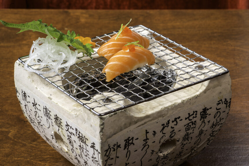 Naast nigiri met dezelfde rijst en verse zalm, opgediend op een wasabi-bodempje en kikkoman sojasaus eroverheen gekwast. Heerlijk oosters. Bij glazen zachtfrisse Vouvray uit de Loirestreek (Marc Bredif): chenin blanc op z’n best (mooie wijnkaart trouwens, bij Fling).