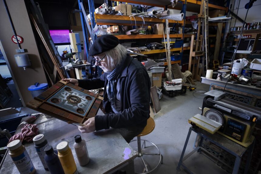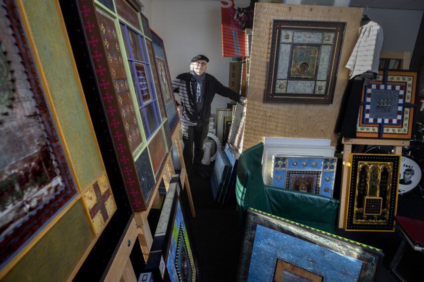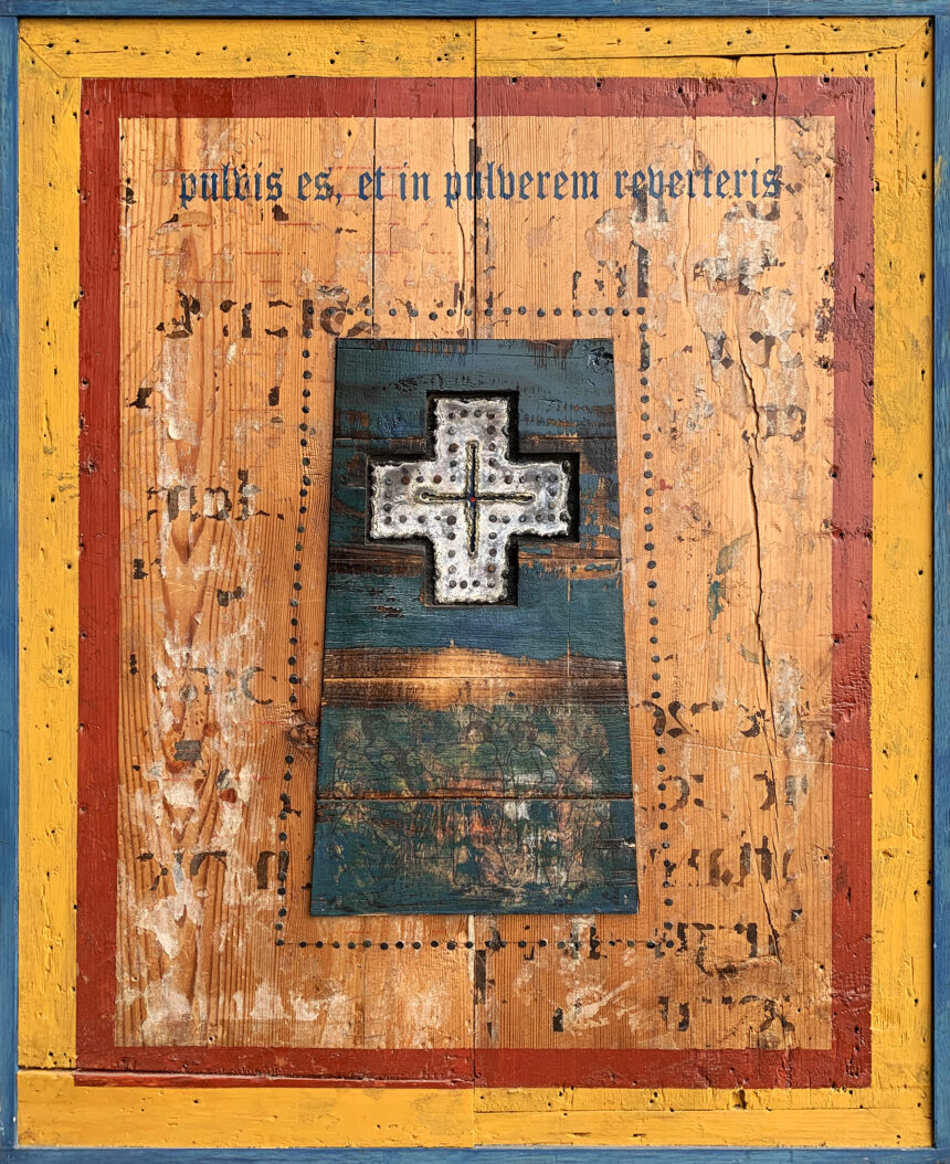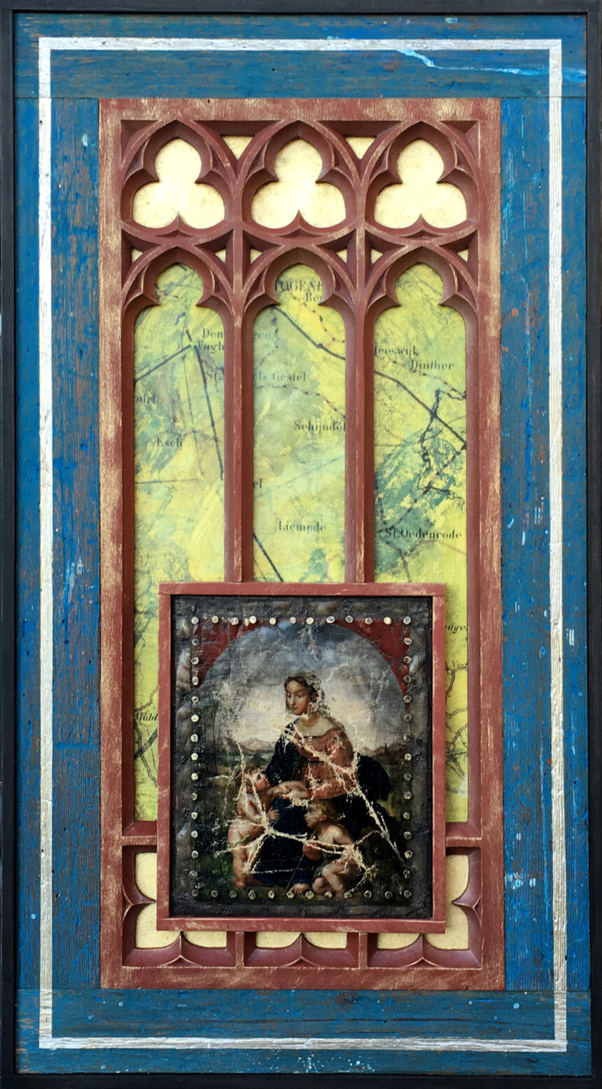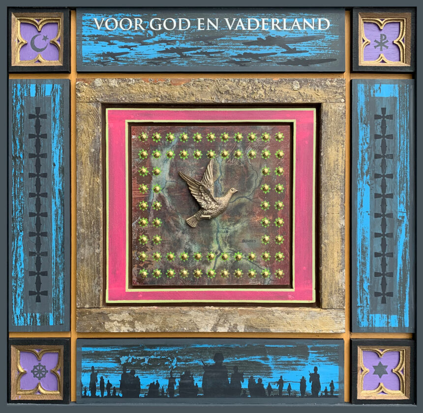Harry Verhoeven is een artistieke alleskunner met een eindeloze creativiteit en een niet te stelpen hoeveelheid energie. Zijn werk is zijn reactie op wie hij is, wat hij heeft meegemaakt en op de veranderende tijden. Hij is onder meer bekend als maker van grote bronzen en cortenstalen beelden. Hij is ook oprichter van het *techniekHuys in Veldhoven (nu onder meer opleidingscentrum van Summa College, red.), de laatste jaren is hij druk met zijn wandassemblages, die hij vorig jaar met veel succes in de Sint Jan in Den Bosch exposeerde. „Al mijn werk ligt mij na aan het hart, maar mijn iconen – dat woord spreekt mij meer aan dan wandassemblages – misschien wel het meest. Het zijn houten panelen waarop ik met diverse materialen zowel mijn eigen leven laat passeren en tijdsbeelden weergeef, als de ambachten die ik heb geleerd toepas.”