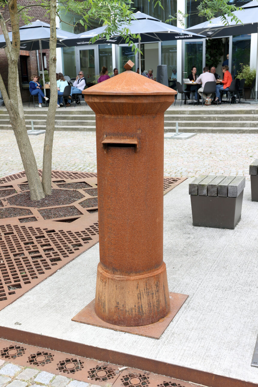 Het waait stevig buiten en het regent. Een blaadje dwarrelt mijn kant op met het geluid van een rennend kind. Ik hoor ‘mama’! Om me heen de bescherming van stijlvolle gebouwen van DOMUSDELA, een school, een kerk, een restaurant en tien millimeter dik cortenstaal.